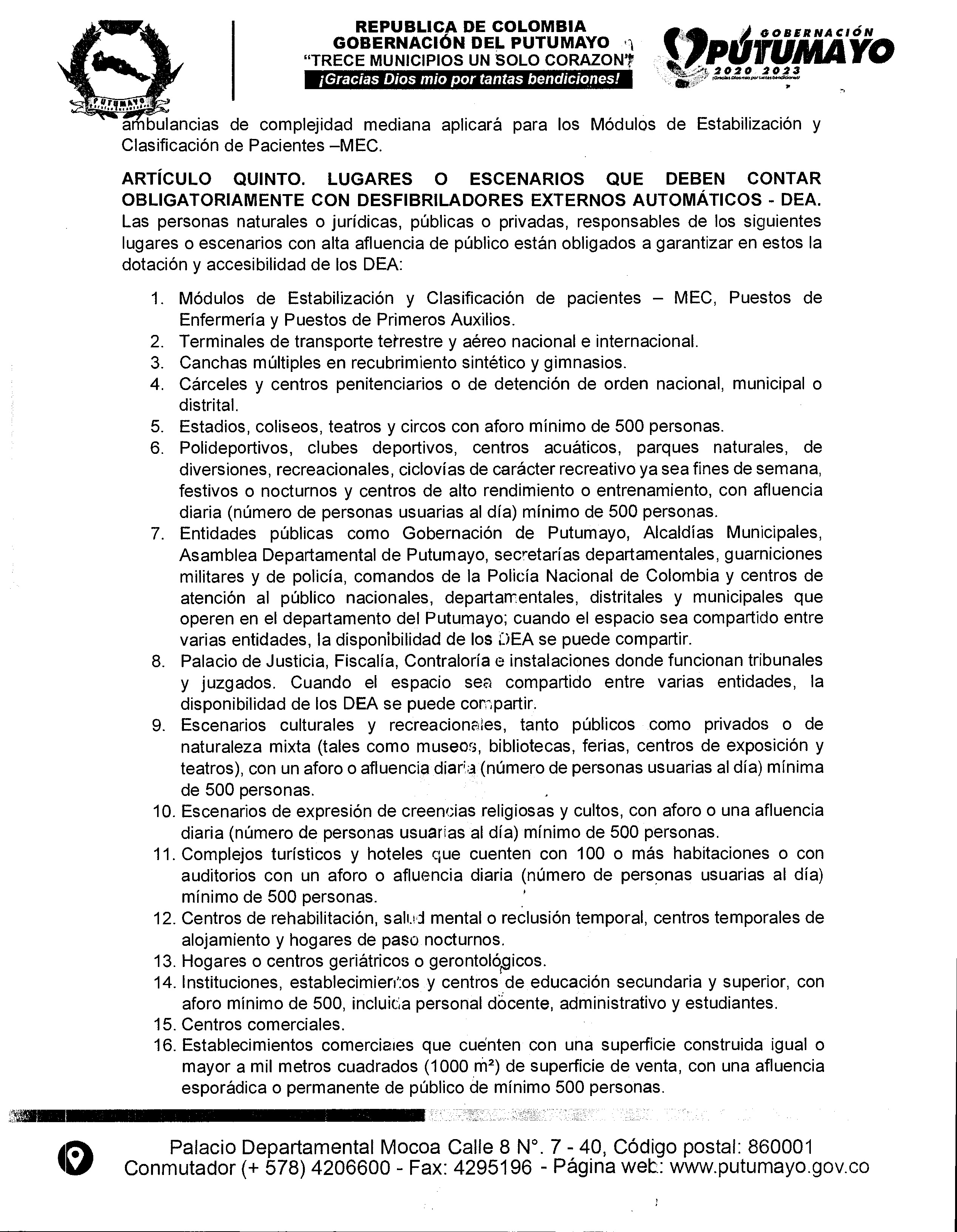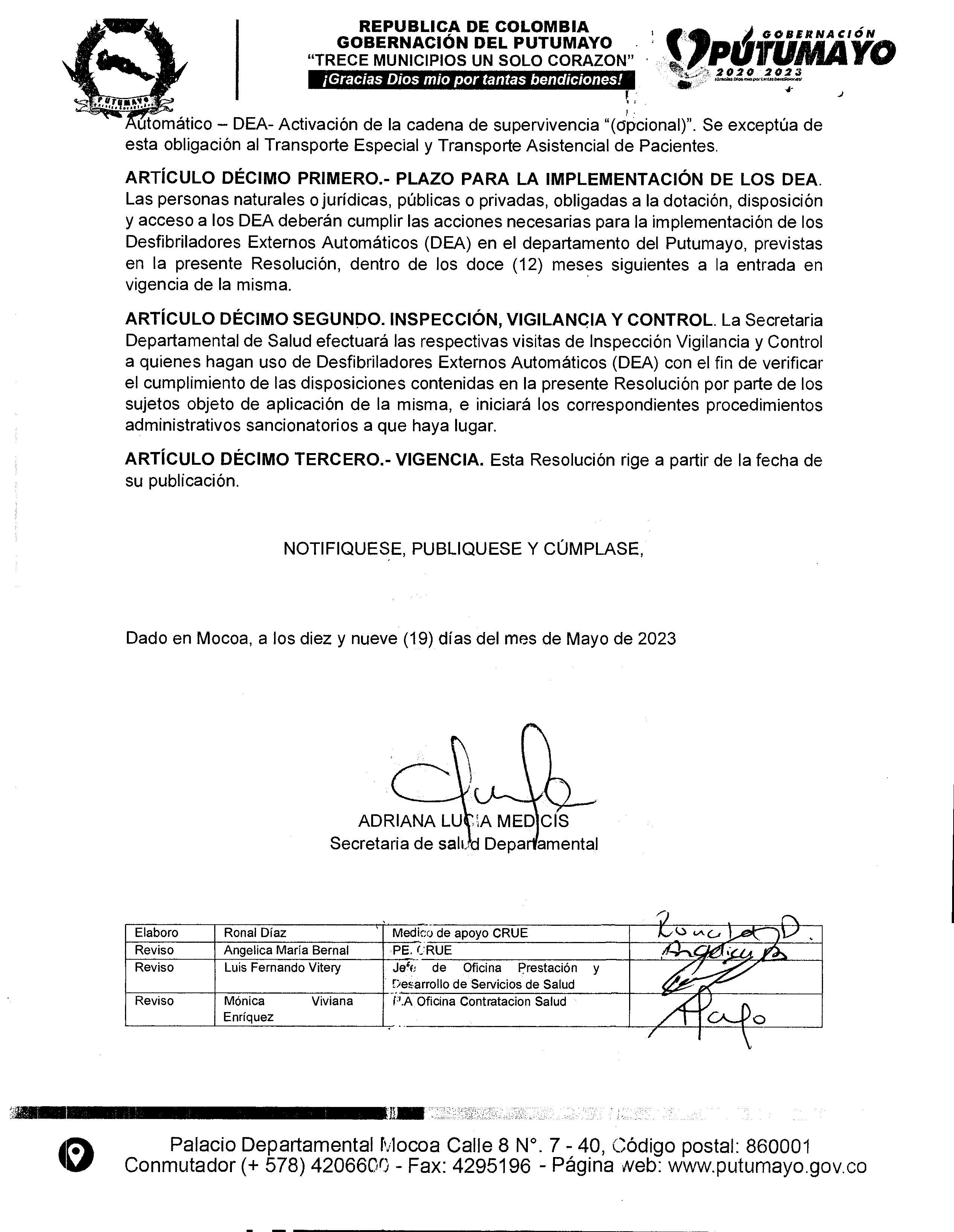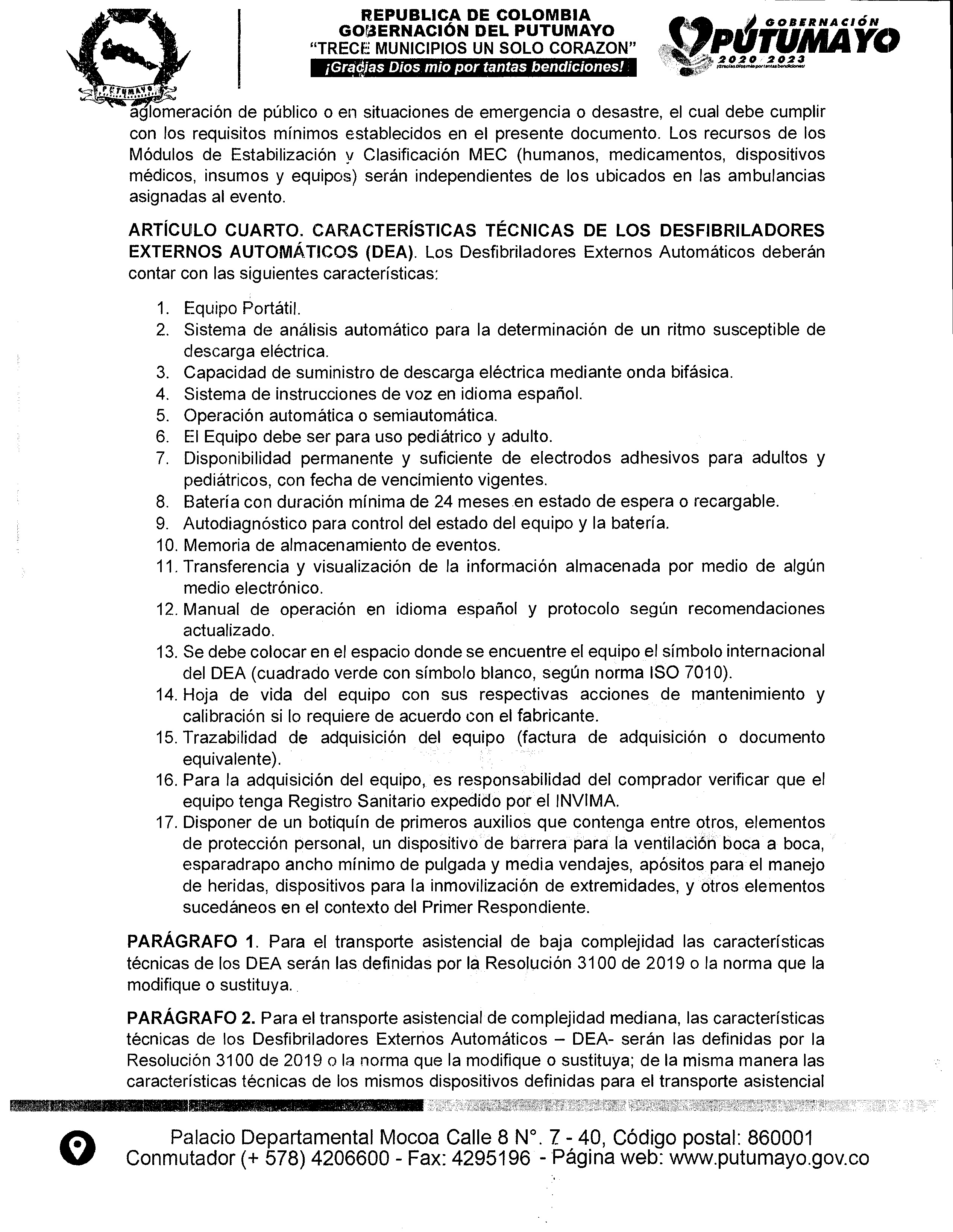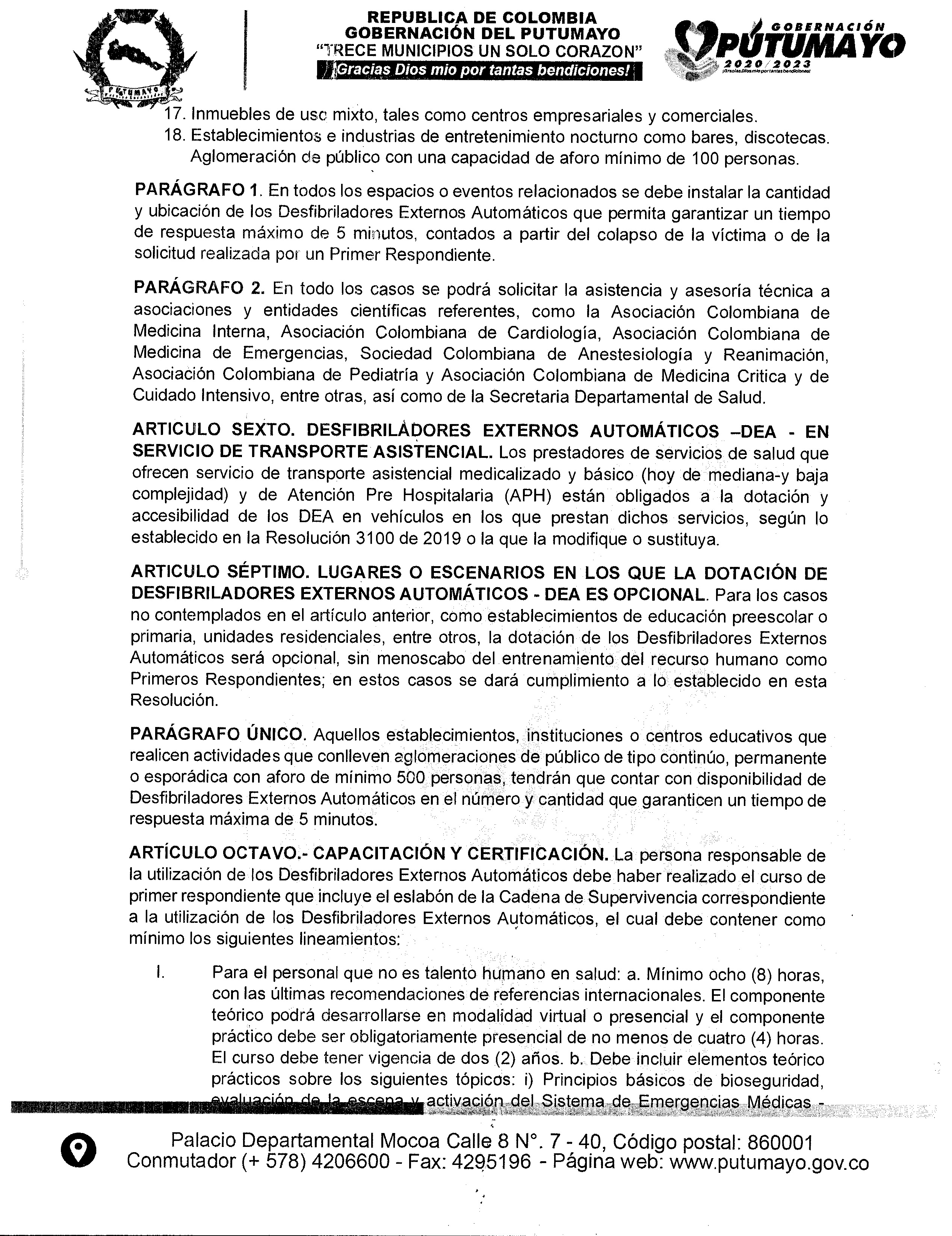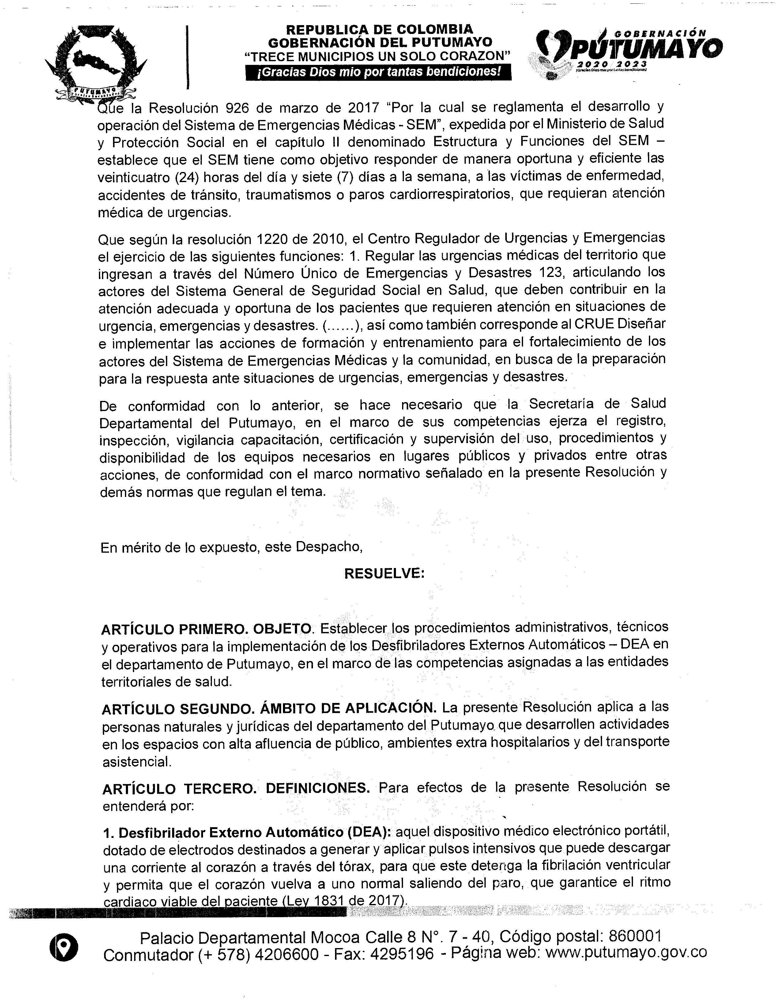 Teniendo en cuenta la normatividad actual y la Resolución 3316 de 2019 emitida por el Ministerio de Salud y Protección social, mediante la cual estableció las disposiciones en relación con los Desfibriladores Externos Automáticos – DEA, en cuanto a la dotación, registro, uso, capacitación, certificación, procedimientos y protocolos para su disponibilidad, simulacros en atención de emergencias que requieran su uso, coordinación de la ruta vital y de emergencia con las entidades hospitalarias y respecto a las acciones de inspección y vigilancia por parte de las entidades territoriales, dado lo anterior la Secretaría de salud Departamental emite la presente Resolución No. 555 del 19 de mayo del 2023), por medio de la cual se da a conocer a las instituciones del Departamento del Putumayo, el uso de los Desfibriladores Externos Automáticos – DEA,  y da un plazo de un año para su funcionamiento a nivel departamental.