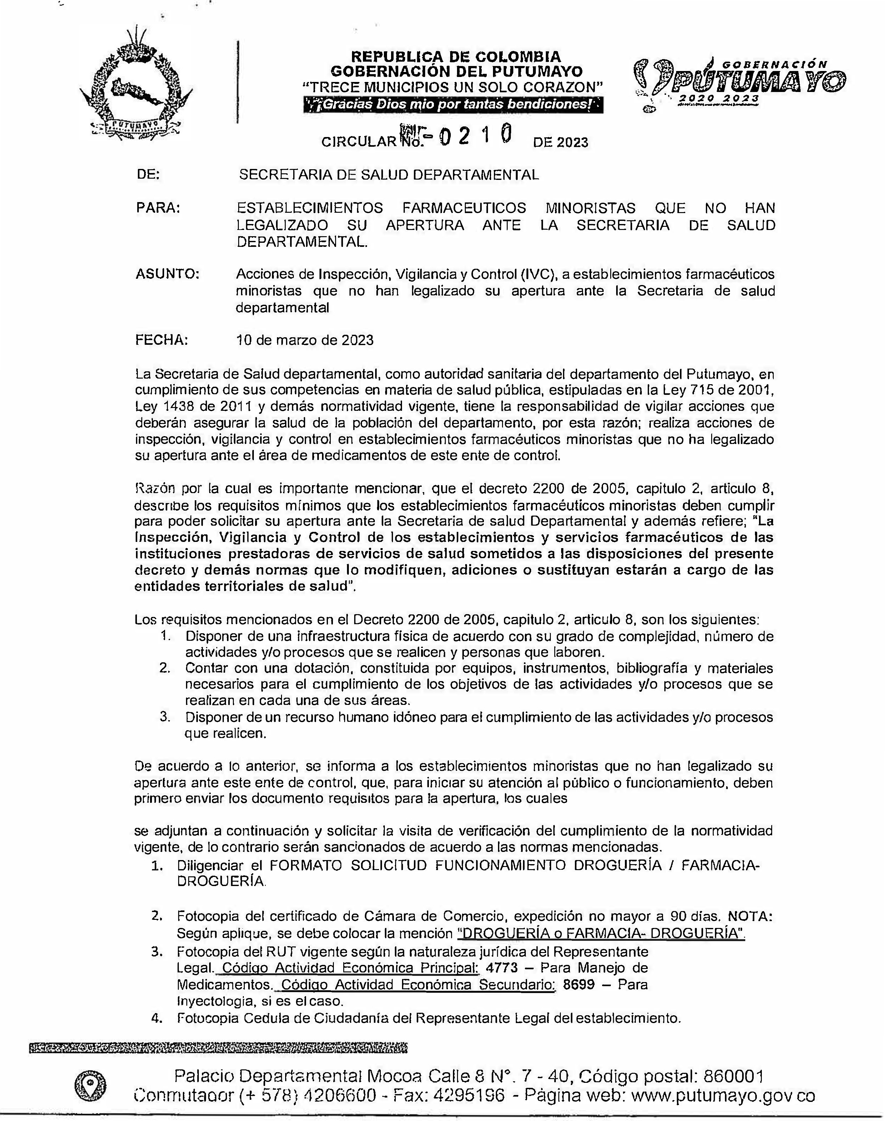 Teniendo en cuenta la normatividad actual y la Resolución 3316 de 2019 emitida por el Ministerio de Salud y Protección social, mediante la cual estableció las disposiciones en relación con los Desfibriladores Externos Automáticos – DEA, en cuanto a la dotación, registro, uso, capacitación, certificación, procedimientos y protocolos para su disponibilidad, simulacros en atención de emergencias que requieran su uso, coordinación de la ruta vital y de emergencia con las entidades hospitalarias y respecto a las acciones de inspección y vigilancia por parte de las entidades territoriales, dado lo anterior la Secretaría de salud Departamental emite la presente Resolución No. 555 del 19 de mayo del 2023), por medio de la cual se da a conocer a las instituciones del Departamento del Putumayo, el uso de los Desfibriladores Externos Automáticos – DEA, y da un plazo de un año para su funcionamiento a nivel departamental.